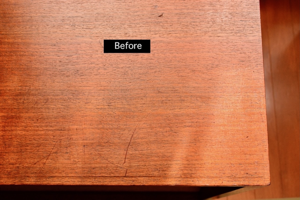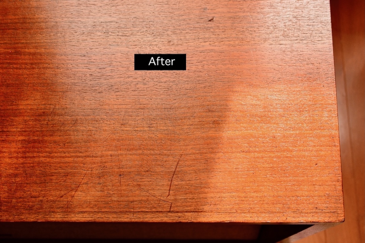 流石に深い傷はスチール・ウールなどで下処理してからでないと綺麗にならないが、家具専用とのことなので処理後は木目が浮かび上がって艶が出ているように見える。