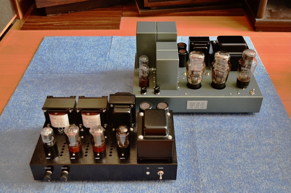 手前ブラックボディのアンプが、奥のコンパチ・アンプの完成を待っていた2020年3月に試聴用としてお借りした6AR6シングルで、2019年真空管オーディオフェアに向けて製作されたTYPEIIとのことである。 (TUBE AUDIO LABO製作記事 https://shinkuukan2.web.fc2.com/2019/13/6AR6.html)