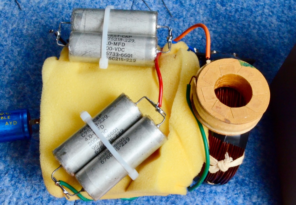 もともと純正XO-5000クロスオーバーネットワークにはERIE 1.5μF 150Vのメタライズド・フィルムコンデンサーが使用されているが、製造後半世紀以上が経って使い物にならないので、これまでは最善と思われるVintageのWEST CAPハーメチック・オイル(左)に交換して使用していた。