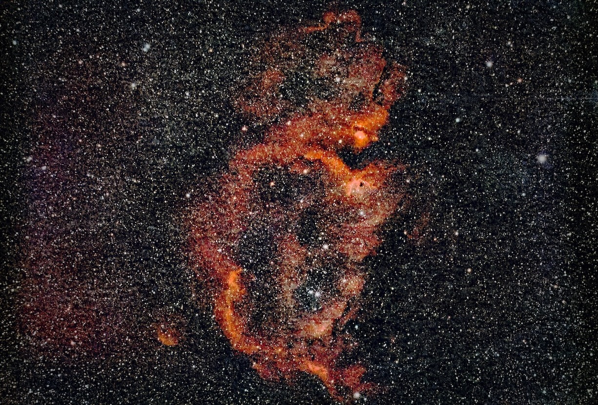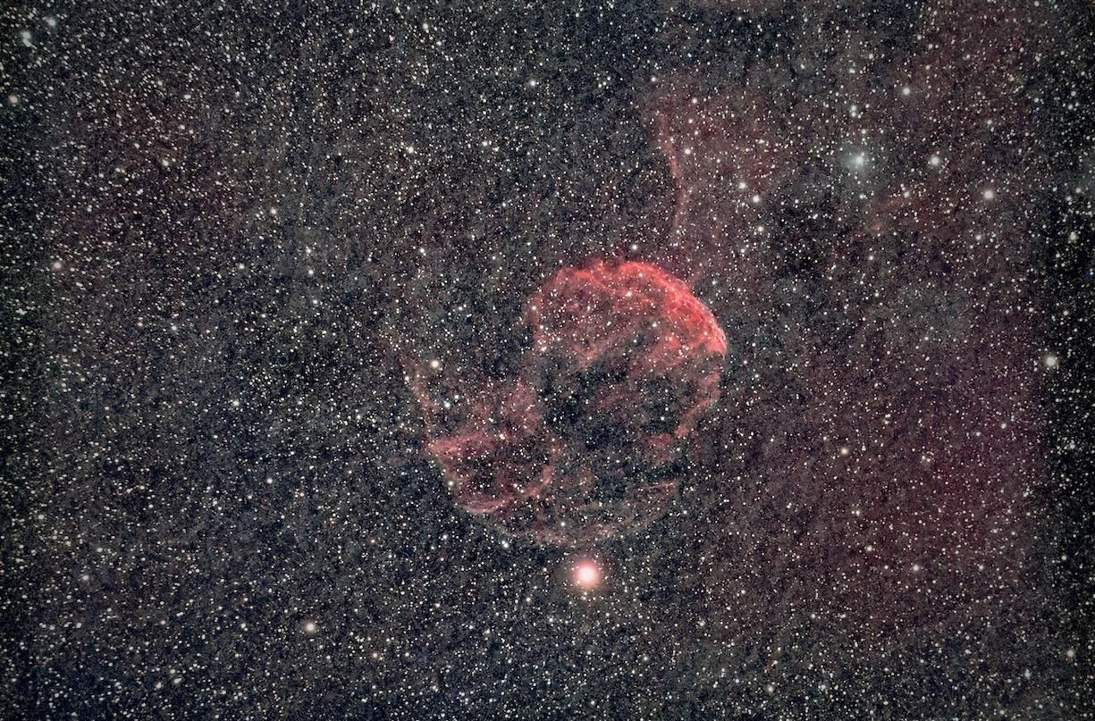 クラゲ星雲は結構淡いので30分の露光ではなかなか浮かび上がってこないが、60分に伸ばすと背景にノイズが目立ってくるので難易度が高い星雲である。