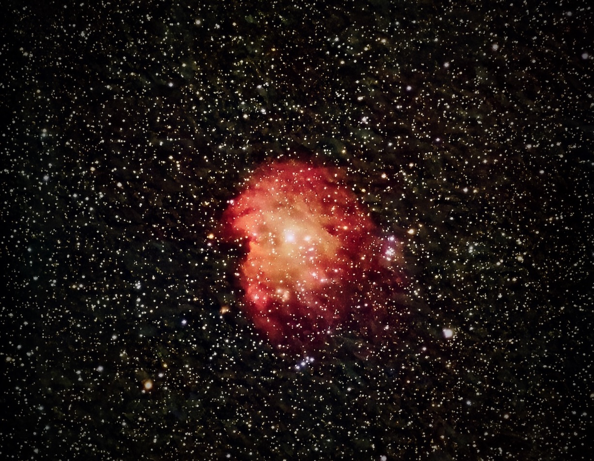この後に撮影したプレアデス星団は周辺減光の激しい更にボヤけた画像となったので、夜露でレンズに曇りが発生したのが原因かもしれない。