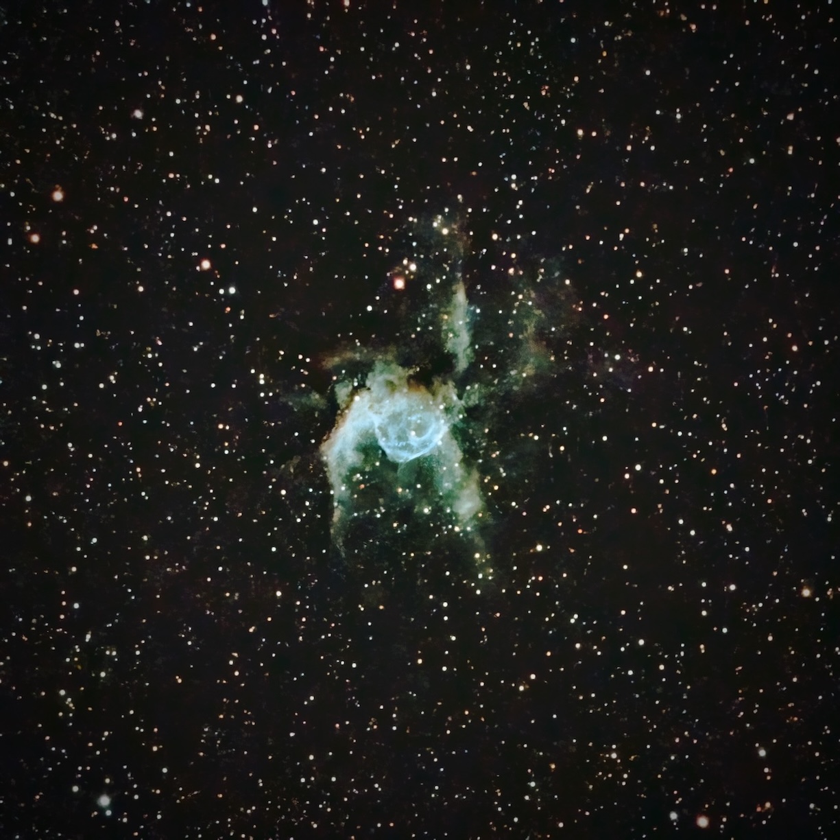 撮影後の画像処理でSirilスクリプトのハッブルマジックを使用すると、普通は赤っぽく映る星雲がこんな感じになって、イカみたいな画像となってしまった。