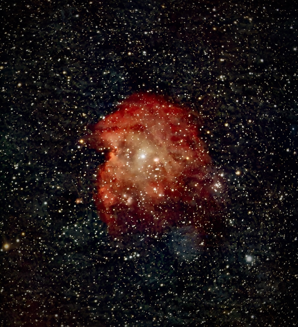 ミルクポット星雲を炙り出す前のGraXpertで周辺減光処理をしただけの画像で、事前に撮影したバラ星雲と全く同じ条件で、少し露出を長めに撮影したものだが、右側に赤い円状の光が写り込んでいる。