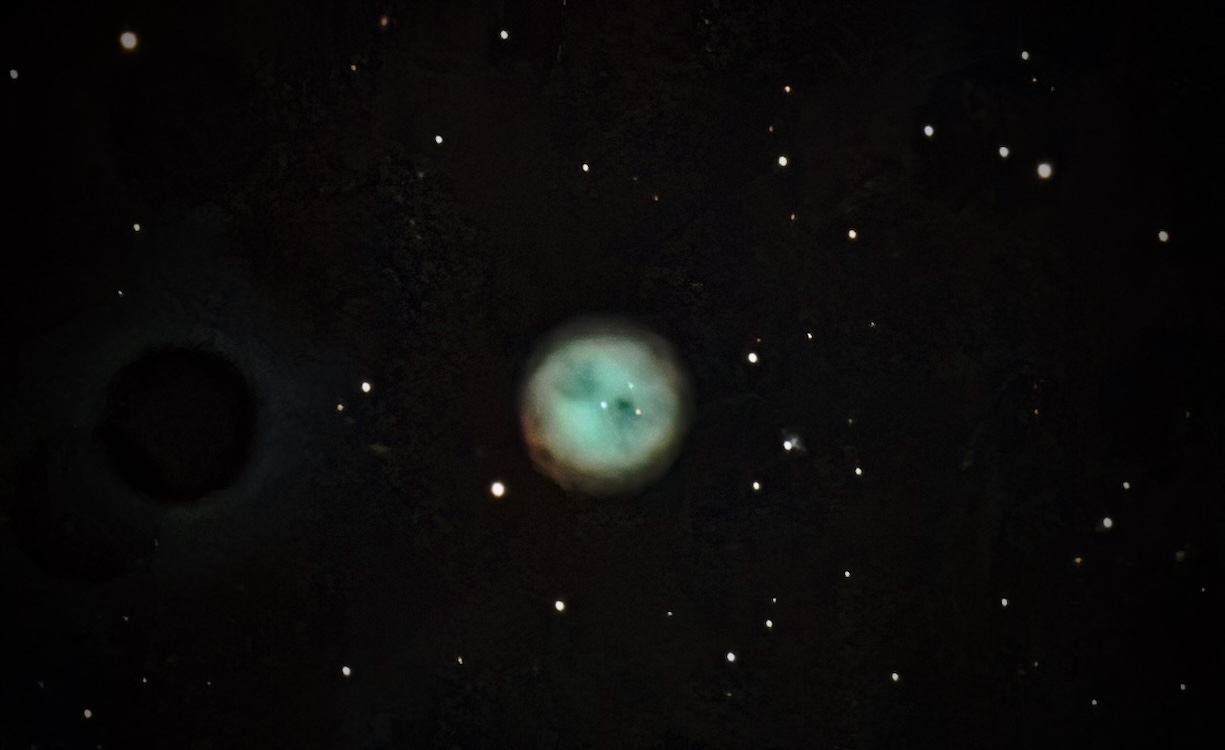 この後に撮影したプレアデス星団は周辺減光の激しい更にボヤけた画像となったので、夜露でレンズに曇りが発生したのが原因かもしれない。